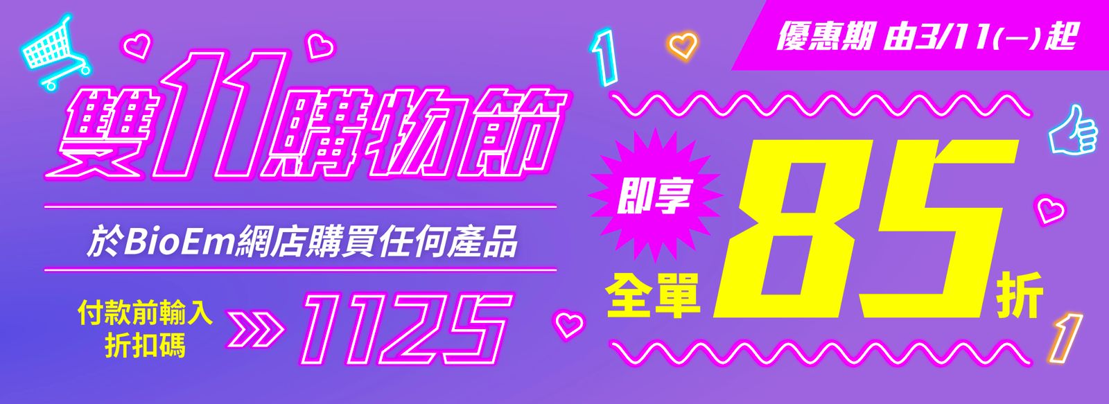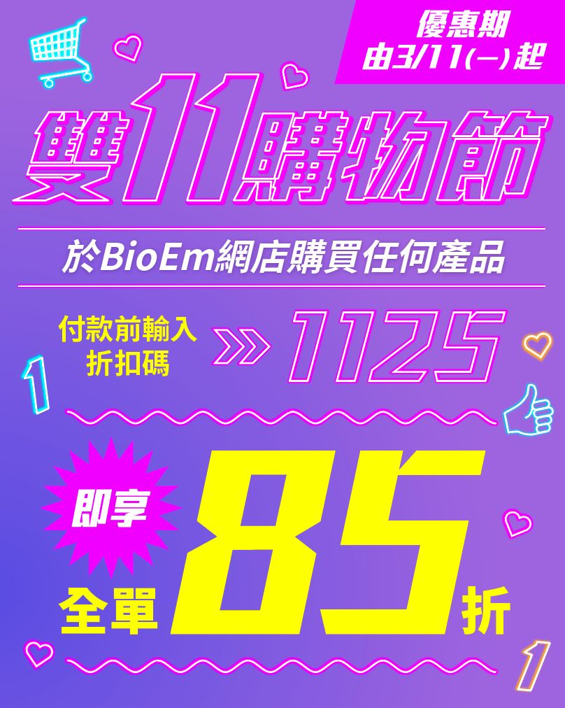 於BioEm網店購買任何產品,並於結帳時輸入折扣碼「1125」,即可全單85折