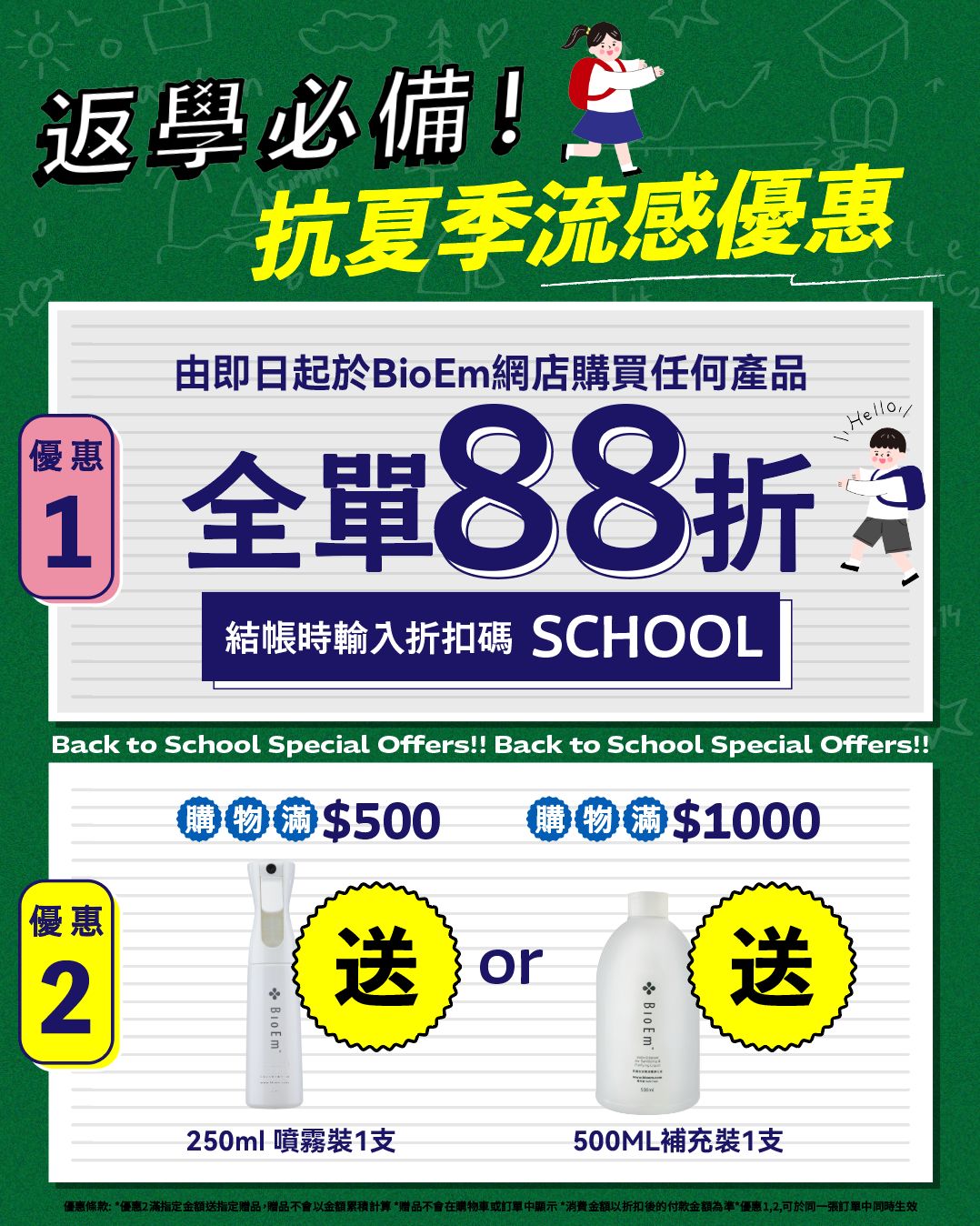 於BioEm網店購買任何產品,並於結帳時輸入折扣碼「SCHOOL」,即可全單88折