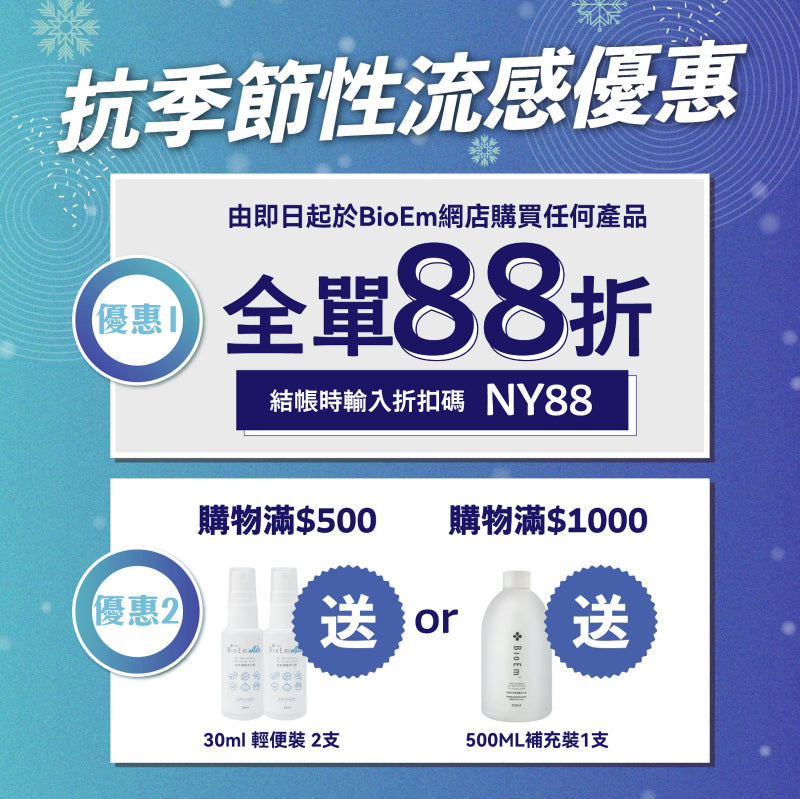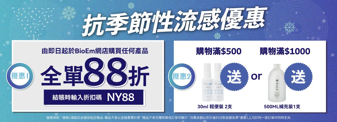 於BioEm網店購買任何產品,並於結帳時輸入折扣碼「NY88」,即可享全單88折