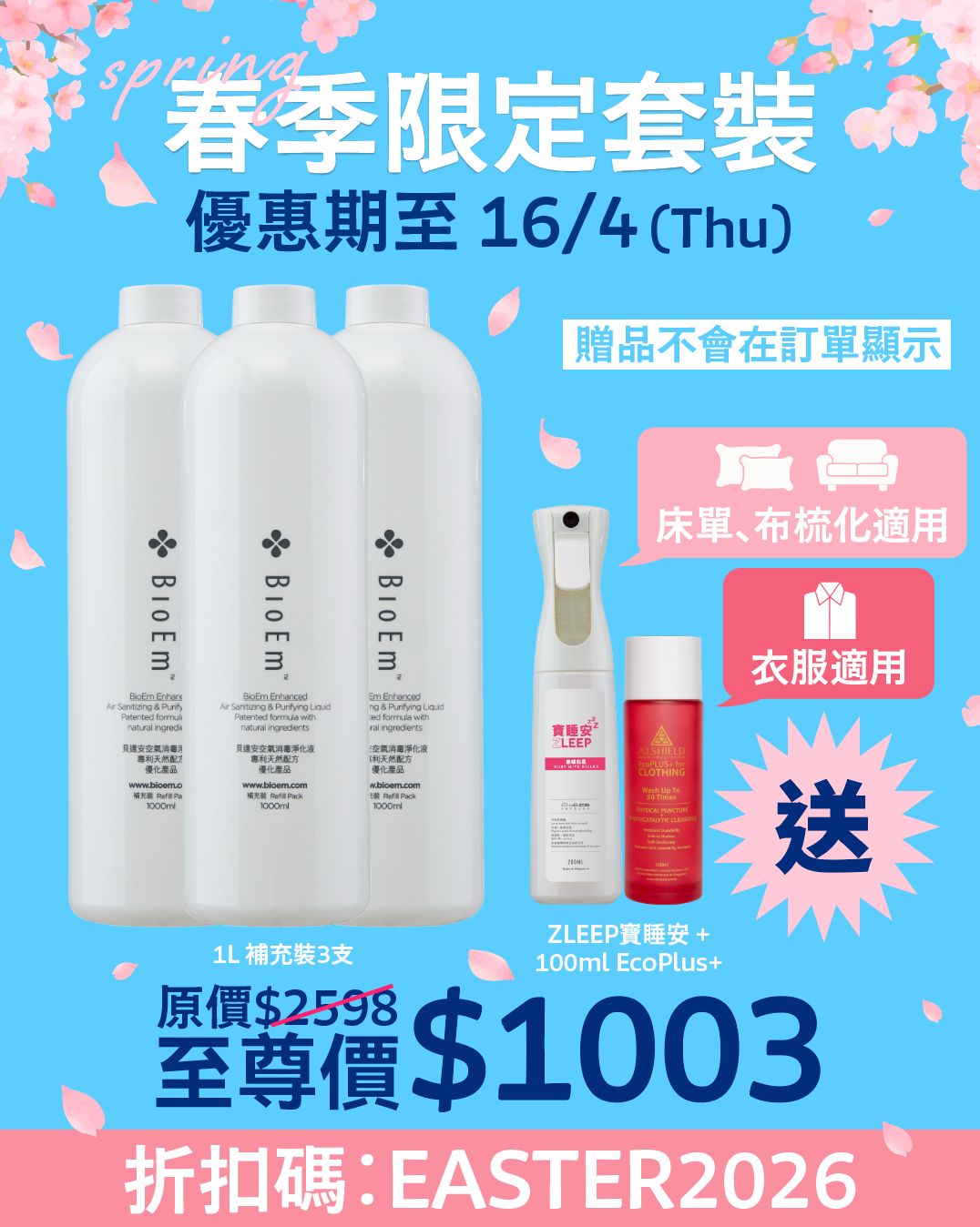 BioEm 1L 補充裝 ×2支 + EcoPLUS+ for Clothing 100ml ×1支 +家用噴霧或噴手機 (3選1)