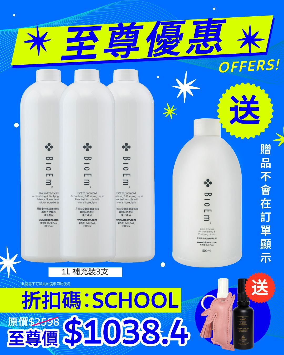 BioEm空氣消毒淨化液,專利配方,採用天然植物精華提鍊而成,能有效殺滅多種細菌及病毒(如: 沙士SARS、甲型流感H1N1、EV71腸病毒、禽流感H5N1、人流感H3N2、軍團菌和抗藥性金黃葡萄球菌等),分解總揮發性有機化合物 (TVOC),如: 甲醛及除異味。 產品獲權威機構認證,安全可靠,適合任何年齡人士使用。