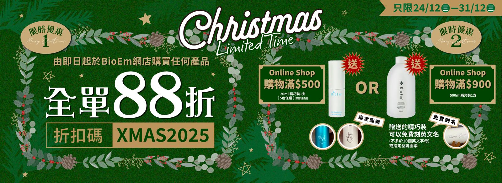 於BioEm網店購買任何產品,並於結帳時輸入折扣碼「XMAS2025」,即可全單88折